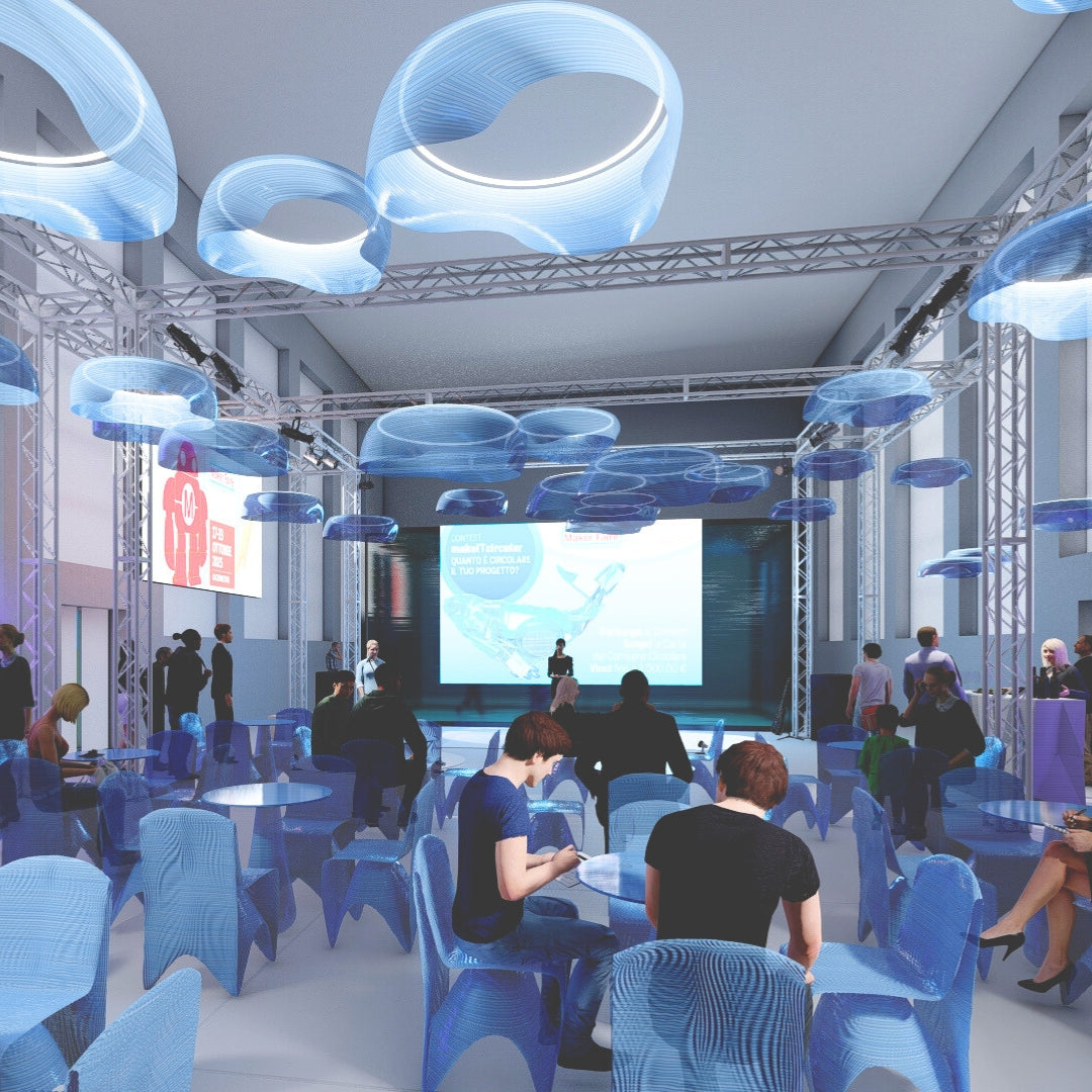A sustainable installation for Maker Faire Rome 2025, inspired by water in its three states—solid, liquid, gas. Designed with PLA bioplastic, the space blends innovation, flexibility, and circular design, offering tables, seating, and installations that embody fluidity, networking, and creativity.