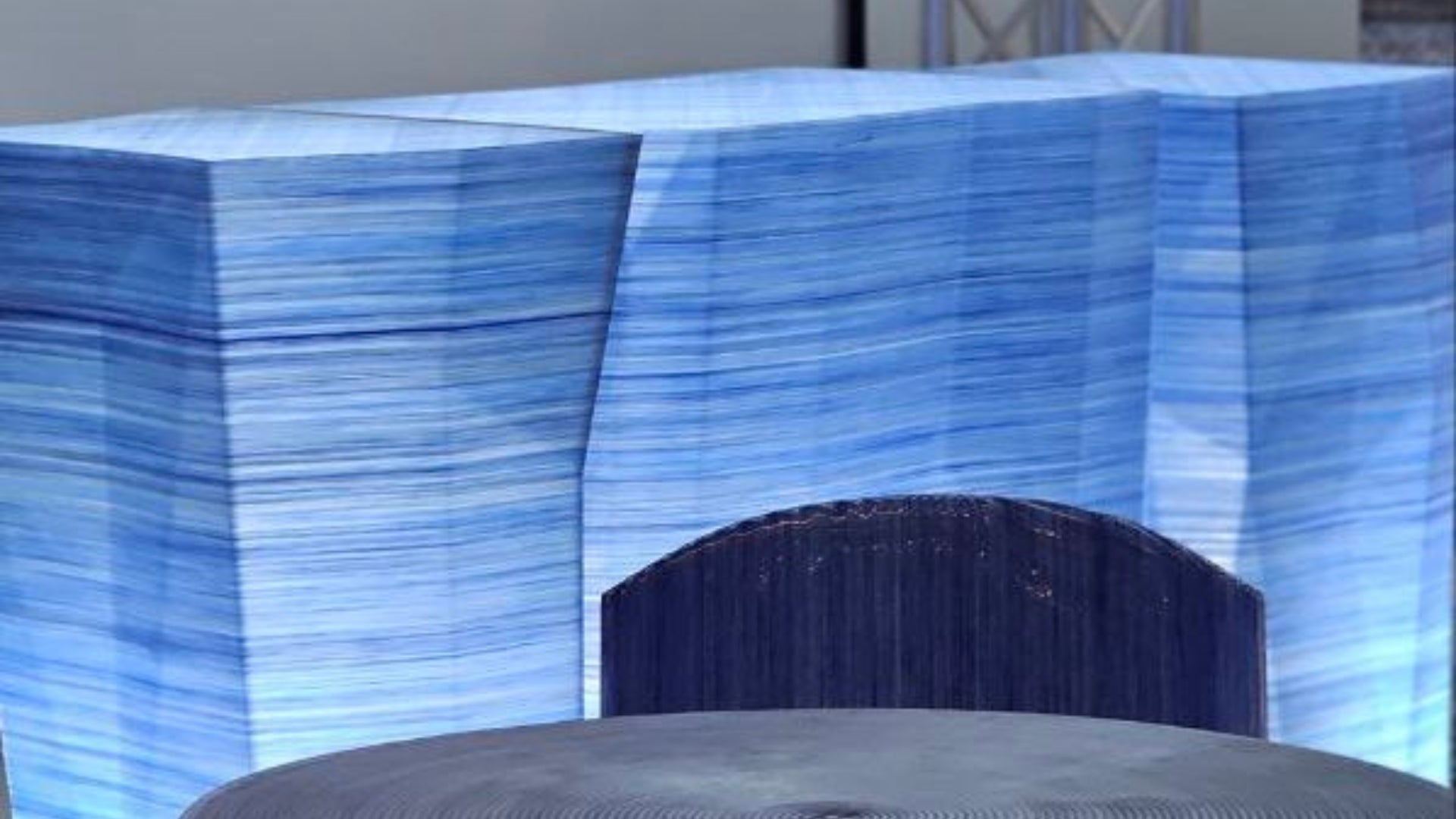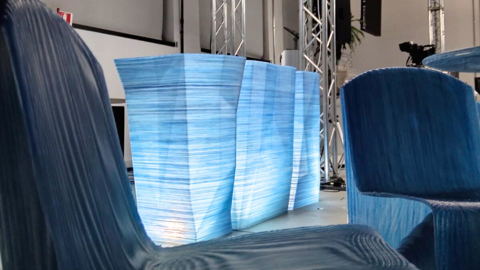L’allestimento incarna l’idea del movimento reso tangibile — arredi che si adattano, evolvono e respirano come dati in costante trasformazione. Concepito come un’area hospitality fluida e modulare, lo spazio comprende nove tavoli, trentasei sedie, un bancone bar e sedici lampade, tutti interamente stampati in 3D.